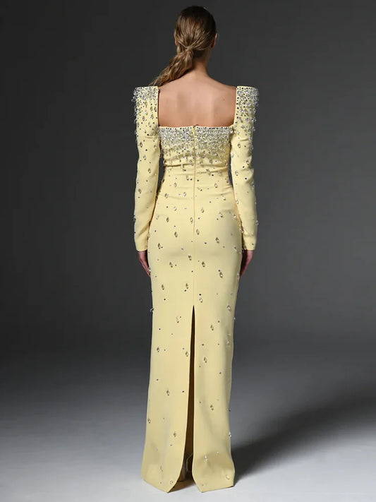 HIGH QUALITY Newest Fashion 2025 Designer Vestido Women's Square Collar Beading Diamonds Long Sleeve Maxi Dress