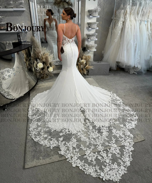 BONJOURY Charming Appliques Wedding Dresses For Woman Bride Button Trumpet Spaghetti Straps Vestidos De Noiva Customized