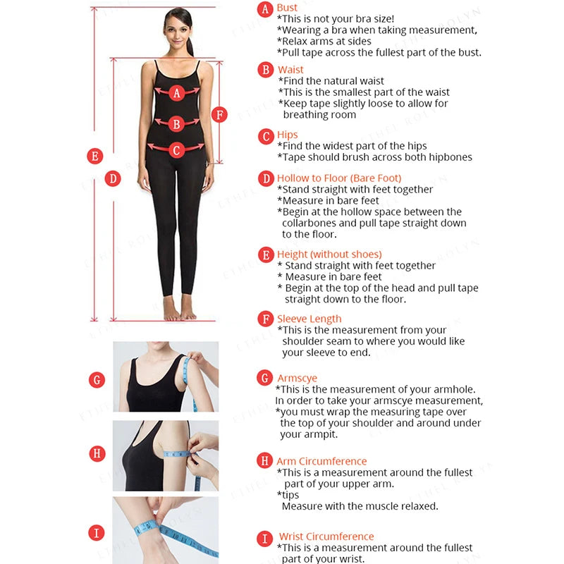 - US6 size : Bust: 34.5 inches, Waist: 27.5 inches, Hips: 37.75 inches, Hollow to Floor: 59 inches.